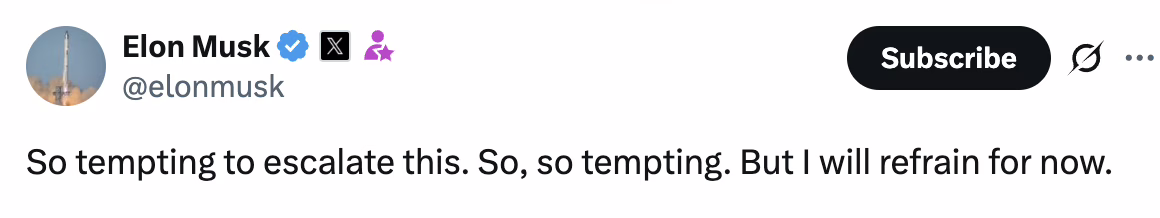Musk didn’t hold back either. Responding to a clip of Trump’s remarks, he tweeted, “So tempting to escalate this. So, so tempting. But I will refrain for now.”