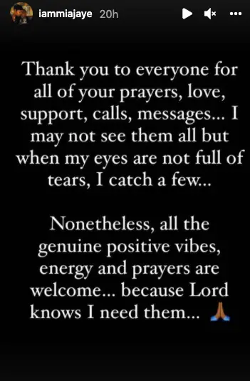Mia Jaye further posted a message of gratitude to their supporters, “Thank you to everyone for all of your prayers, love, support, calls, messages… I may not see them all but when my eyes are not full of tears, I catch a few…”