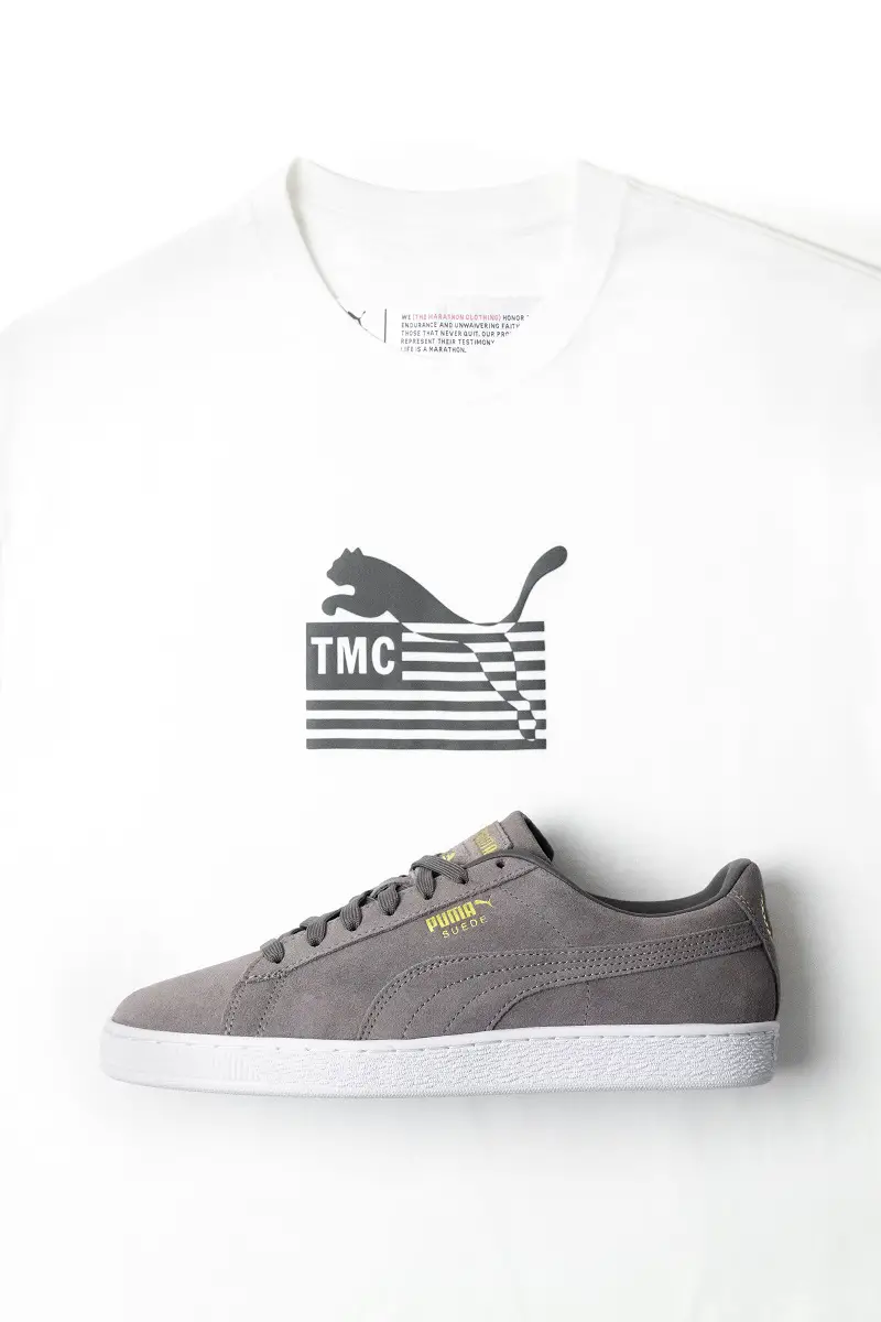 Starting May 7, the limited-edition white co-branded Hussle Way logo t-shirt and the classic Puma Suede sneakers will be available at PUMA.com, the Puma NYC Flagship store, and at select retailers including The Marathon Clothing store in Los Angeles.