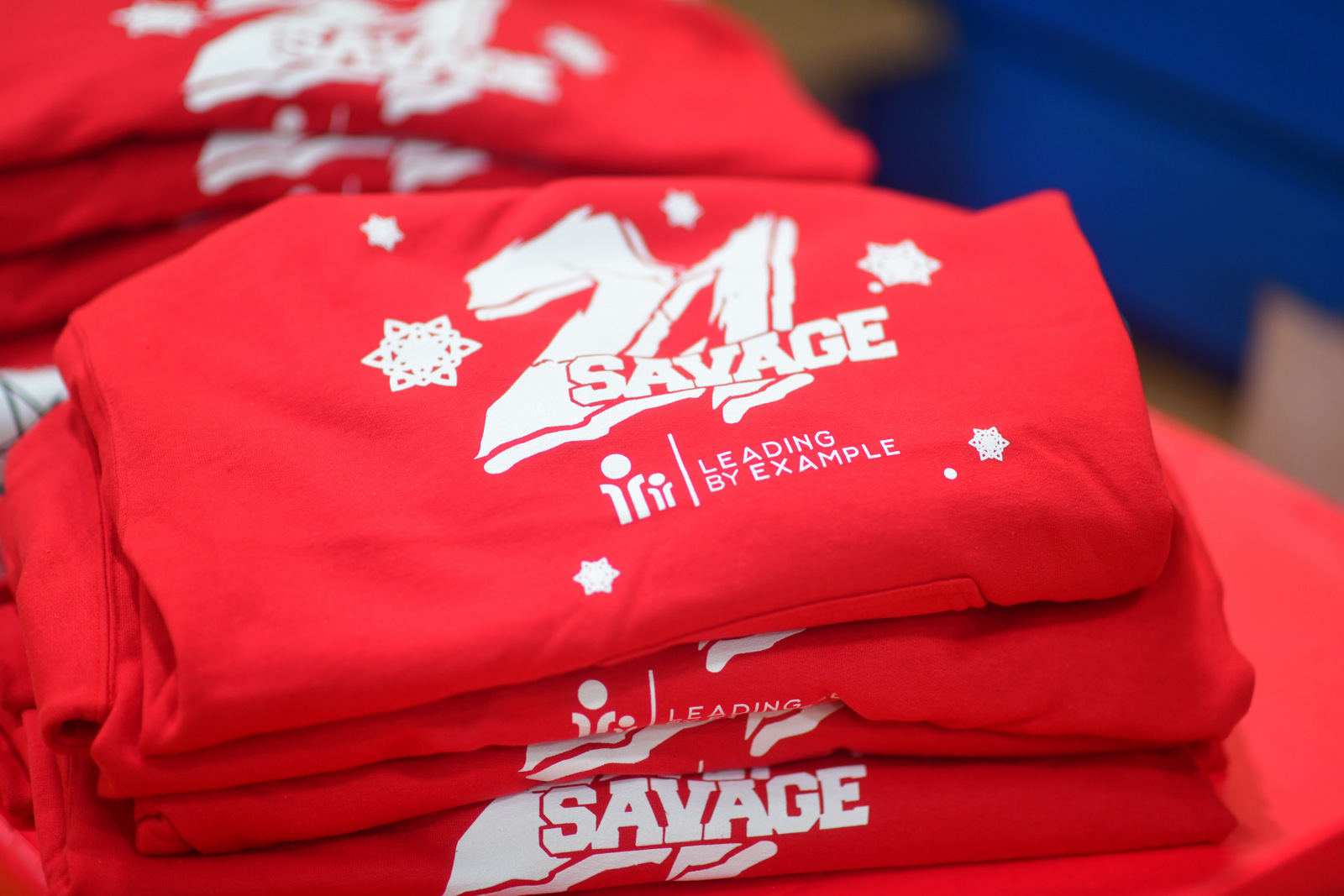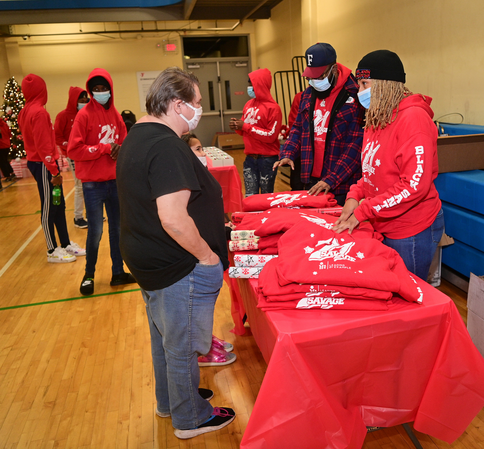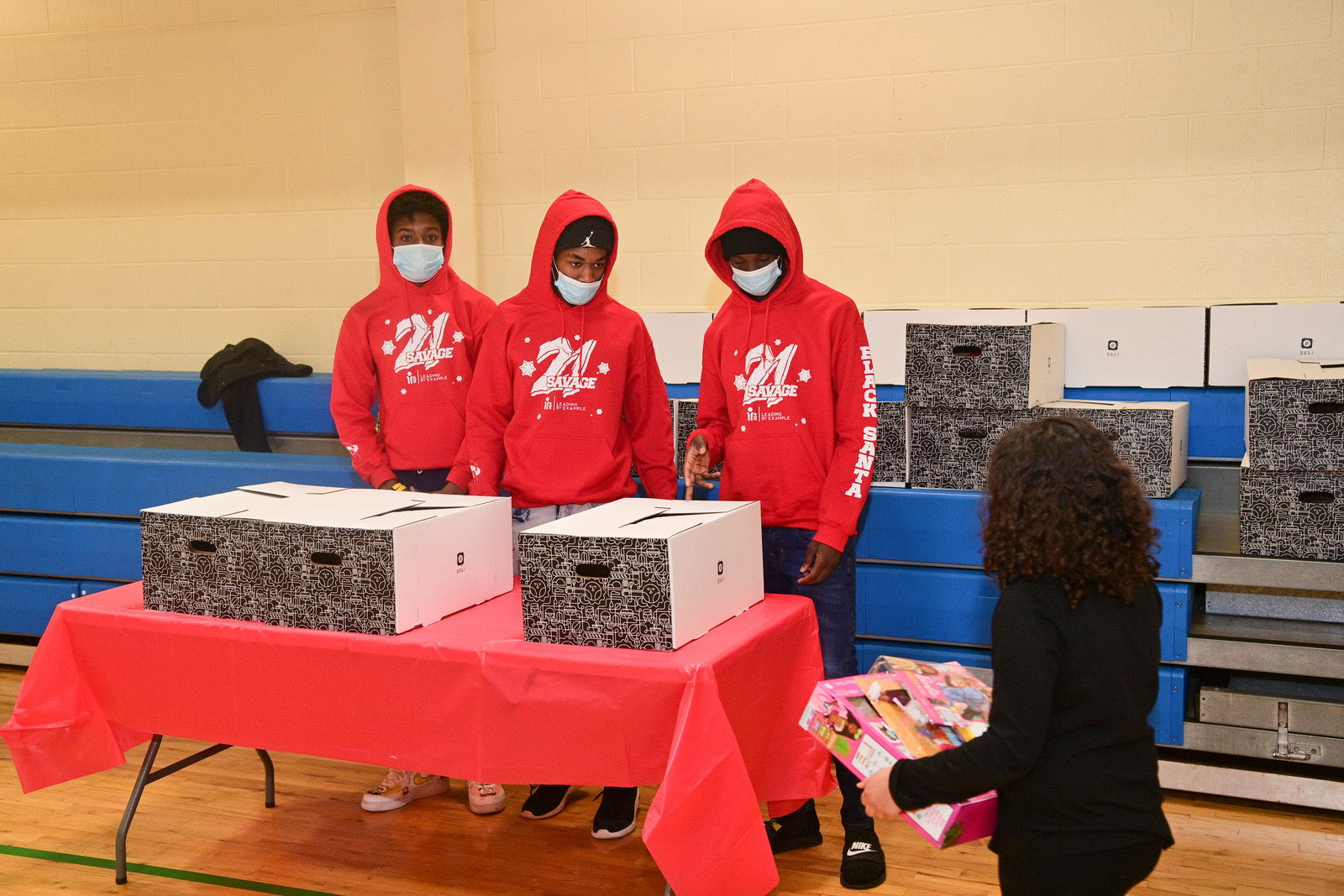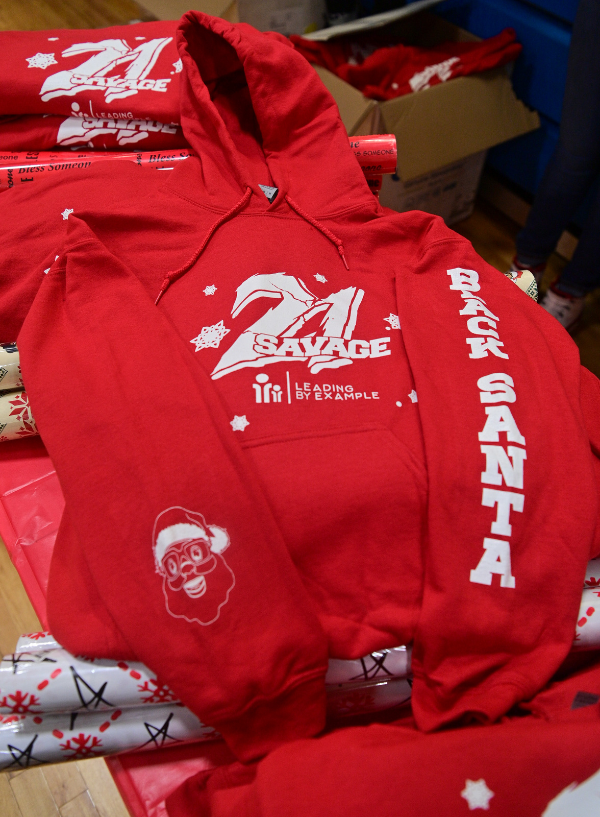 Savage and LBE gave each child in attendance Christmas gifts and meals for their whole families. In addition, the “Bank Account” rapper partnered with Black-owned holiday apparel brand Black Santa to create “21 Savage X Black Santa” holiday sweatshirts to give away at the location.