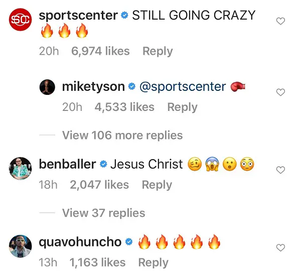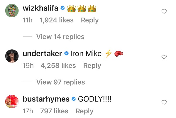 Quavo, Wiz Khalifa, The Undertaker, Busta Rhymes, Steve Harvey, Timbaland, Murda Beatz, Stevie J, and Shaunie O’Neal were among the other “blue checks” to sound off about the “Baddest Man On The Planet.” Mike Tyson’s Instagram video has collected more than 6 million views in 19 hours.