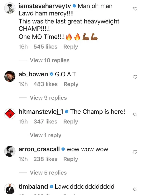 50 Cent posted, ” [Mike] look like he can win another title. wait there gotta be some more money around here.” Comedian Martin Lawrence commented, “Aight guess I can scratch out any @miketyson jokes for the future. Not even gonna go there ✊ .”