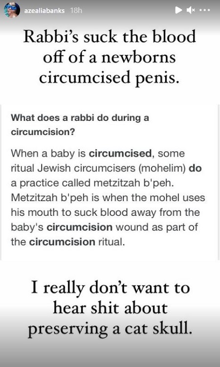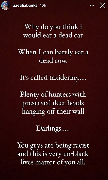 “Why do you think I would eat a dead cat when I can barely eat a dead cow? It’s called taxidermy…” wrote Banks on her IG Story. “Plenty of hunters with preserved deer heads hanging off their wall. Darlings… you guys are being racist and this is very un-black lives matter of you all.”