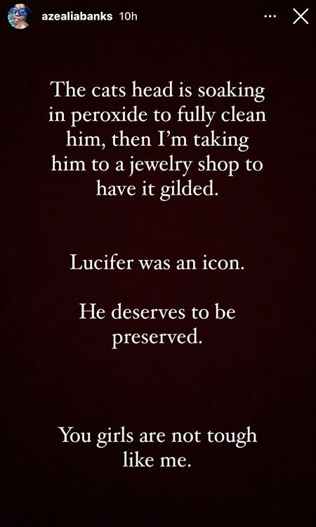She went on to add, “The cat’s head is soaking in peroxide to fully clean him, then I’m taking him to a jewelry shop to have it gilded. Lucifer was an icon. He deserves to be preserved. You girls are not tough like me.” Banks also highlighted certain religious rituals associated with Catholicism, Christianity, and Judaism.