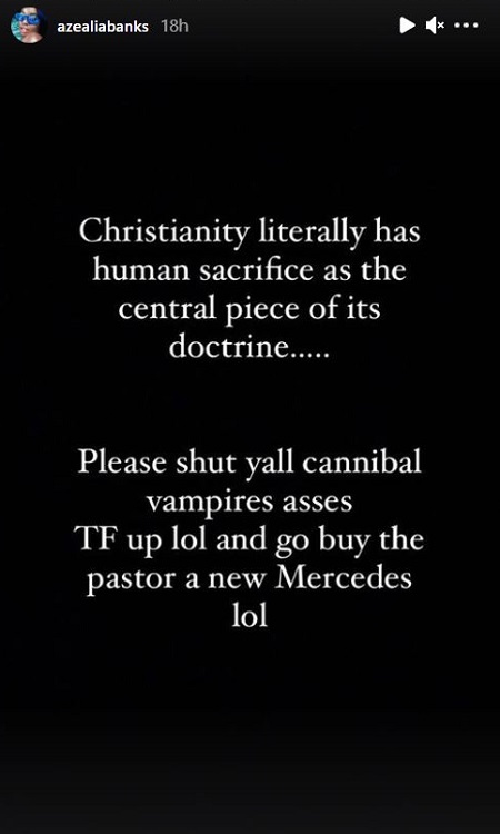 Banks also took a direct shot at Christians. She told the followers of Jesus, “Please shut y’all cannibal vampire a#### [the f###] up lol and go buy the pastor a new Mercedes lol.” Later, AB uploaded another video of her cat with a caption of her saying she misses the animal “so bad.”