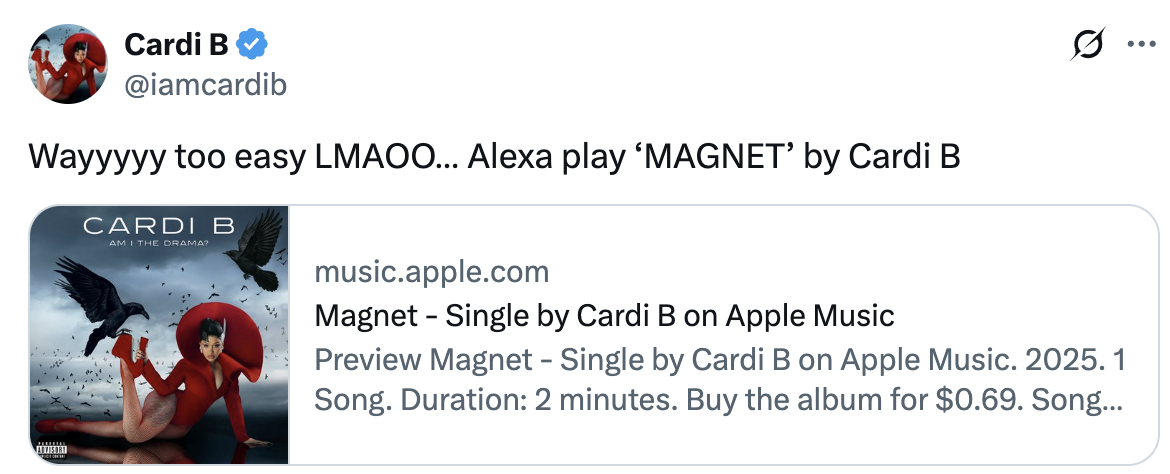 “Wayyyyy too easy LMAOO… Alexa play ‘MAGNET’ by Cardi B,” Cardi tweeted, brushing off the track with a sarcastic nod to her own recent release.