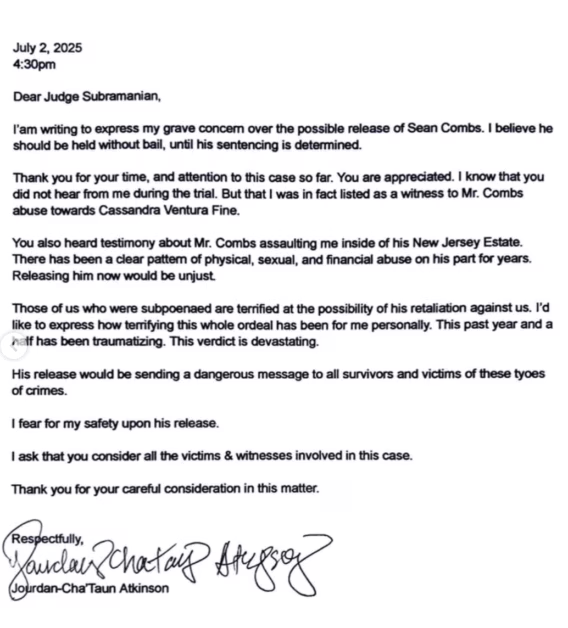 Atkinson, who once worked inside Diddy’s inner circle, posted a video and documents to Instagram after submitting a letter to the judge asking that Combs be denied bail ahead of sentencing.