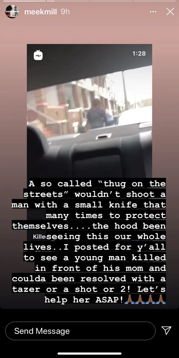 Meek wrote, “A so called ‘thug on the streets’ wouldn’t shoot a man with a small knife that many times to protect themselves… the hood been seeing this our whole lives… I posted for y’all to see a young man killed in front of his mom coulda been resolved with a [Taser] or a shot or 2! Let’s help her ASAP!”