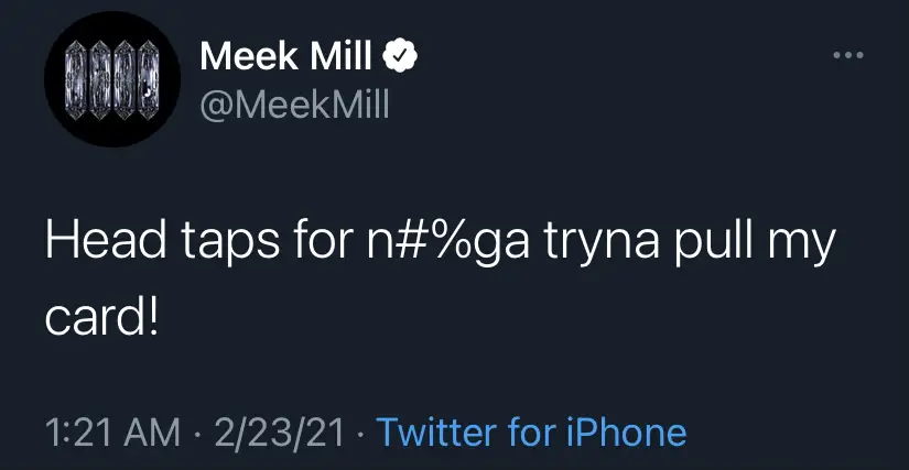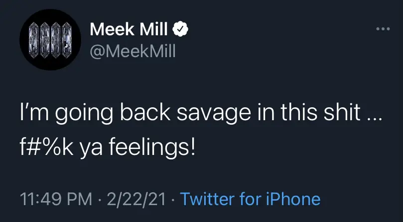 “I’m going back savage in this s### … f#%k ya feelings!” tweeted Meek right before midnight ET. The “Going Bad” performer later posted, “Head taps for n#%ga tryna pull my card!” His name became a top trending topic on the platform.