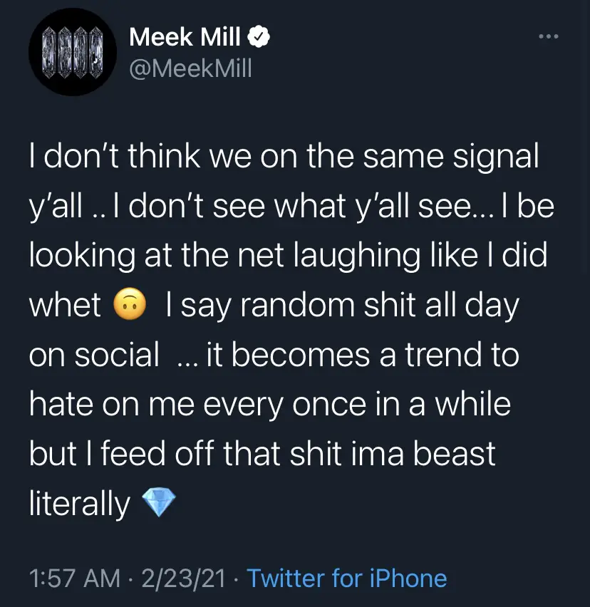 Around 2 am, Meek then added, “I don’t think we on the same signal y’all… I don’t see what y’all see… I be looking at the net laughing like I did whet. I say random s### all day on social… It becomes a trend to hate on me every once in a while but I feed off that s### ima beast literally.”