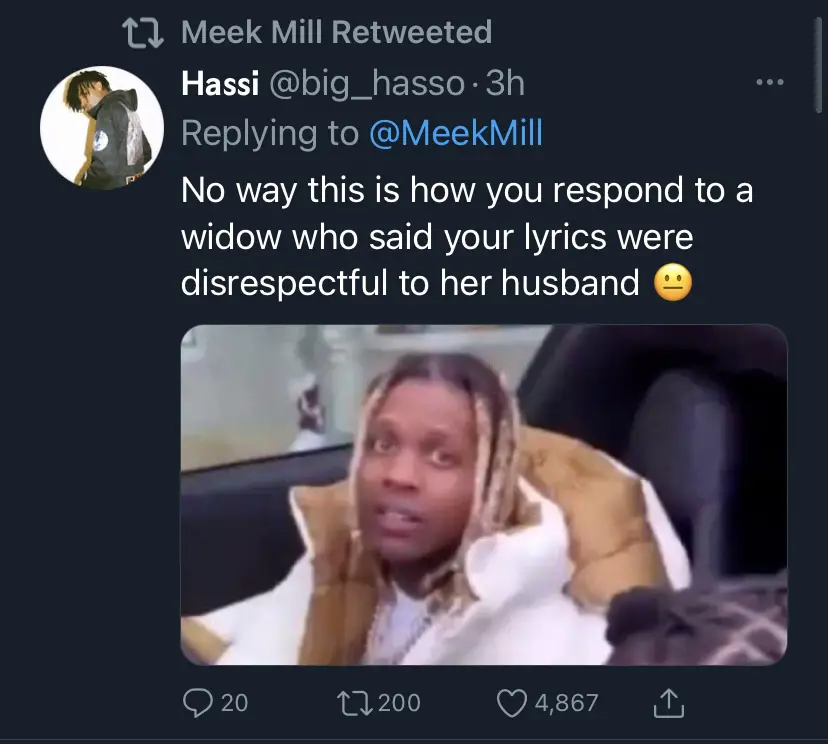 In addition, Meek confuse people even further when he retweeted a random response to one of his tweets. The commenter posted, “No way this is how you respond to a widow who said your lyrics were disrespectful to her husband.”