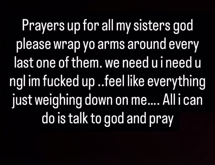 “Prayers up for all my sisters god please wrap yo arms around every last one of them. we need u i need u ngl im f##### up ..feel like everything just weighing down on me…. All i can do is talk to god and pray,” she wrote.