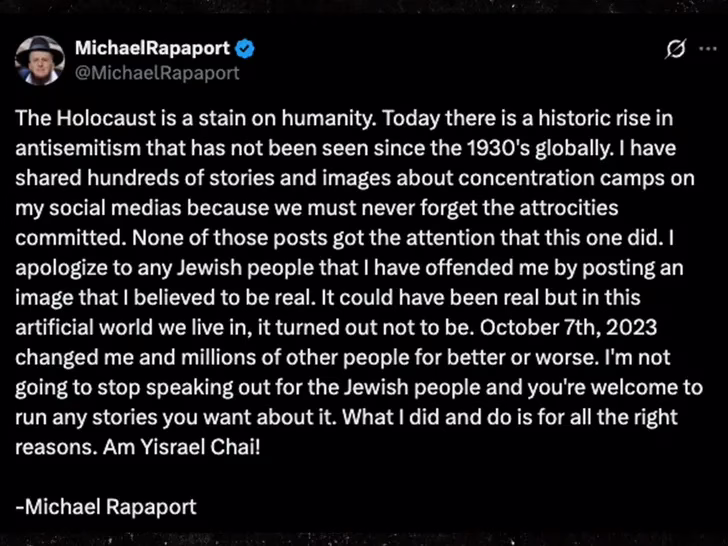 “I apologize to any Jewish people that I have offended me by posting an image that I believed to be real. It could have been real but in this artificial world we live in, it turned out not to be. October 7th, 2023 changed me and millions of other people for better or worse. I’m not going to stop speaking out for the Jewish people and you’re welcome to run any stories you want about it. What I did and do is for all the right reasons.”
