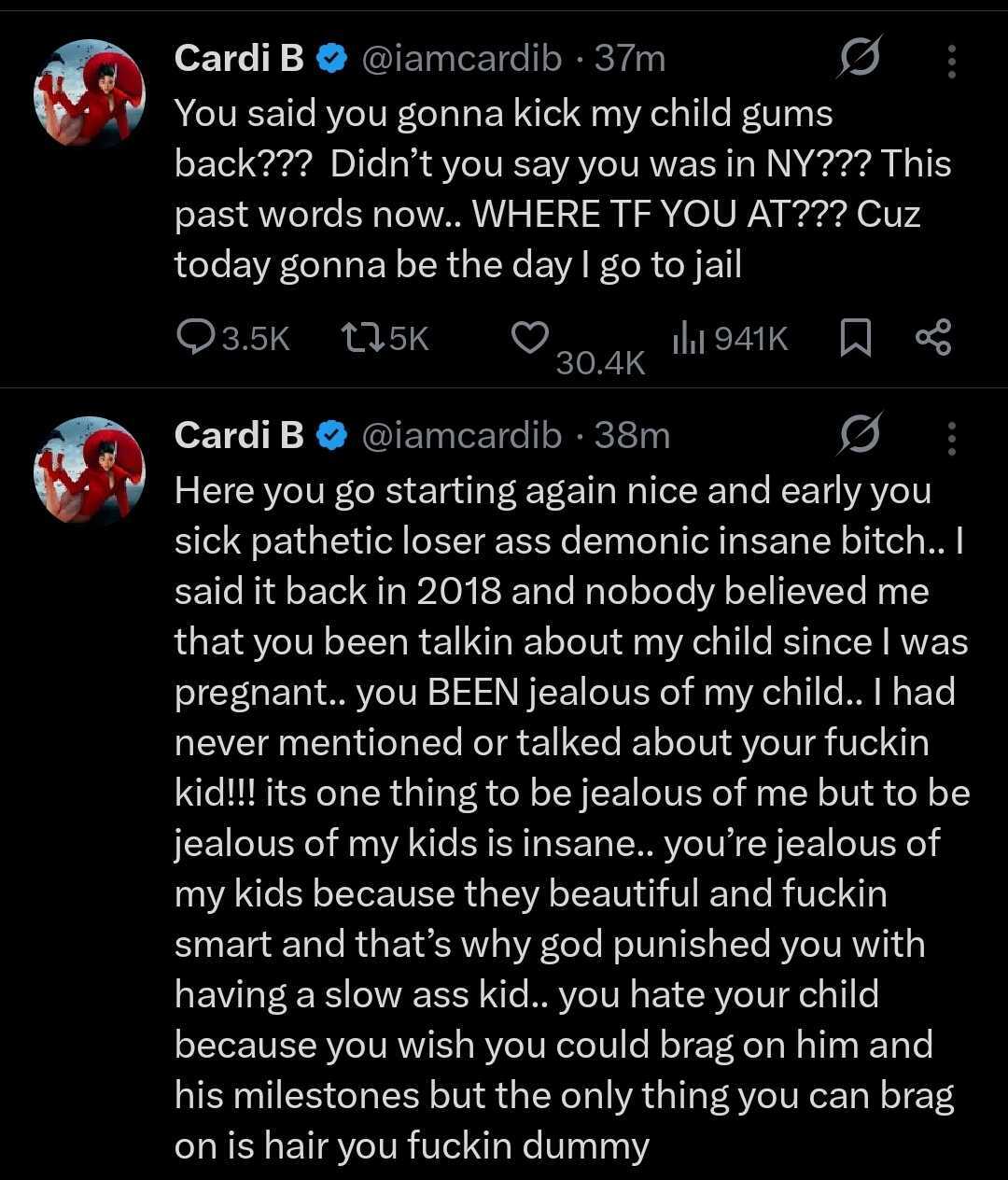 “You BEEN jealous of my child,” Cardi B fumed. “I had never mentioned or talked about your f##### kid!!! It’s one thing to be jealous of me but to be jealous of my kids is insane.”