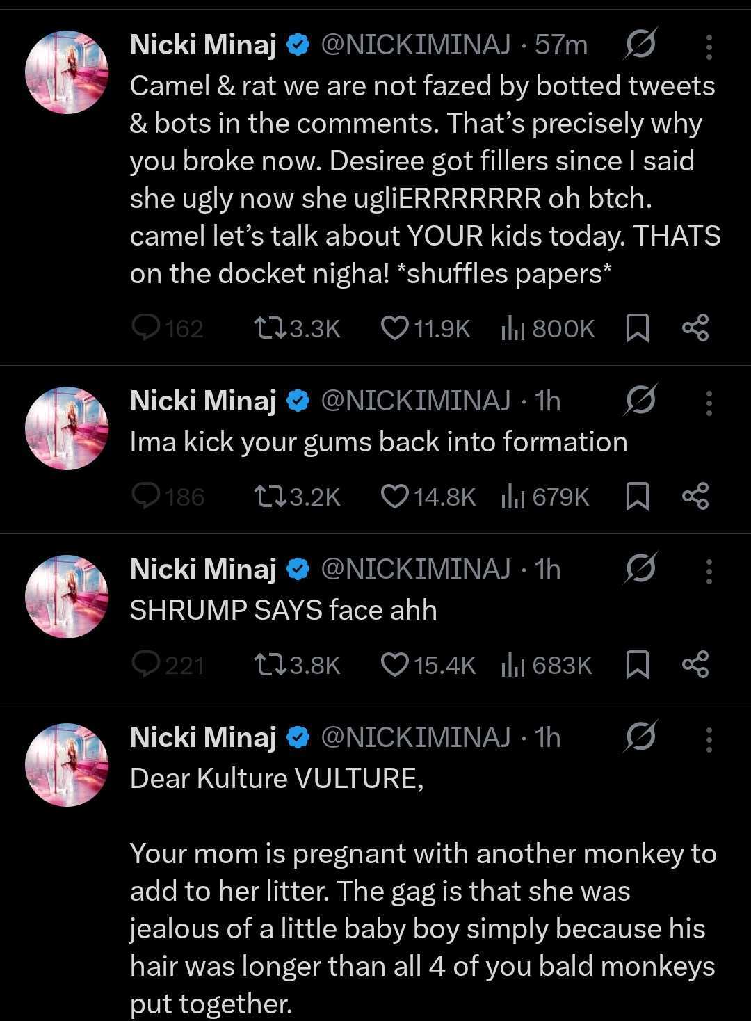 From there, the insults escalated quickly. “Ima kick your gums back into formation,” Minaj posted. She added, “SHRUMP SAYS face ahh.” Then came the most inflammatory line, aimed directly at Cardi’s daughter: “Dear Kulture VULTURE, your mom is pregnant with another monkey to add to her litter.”