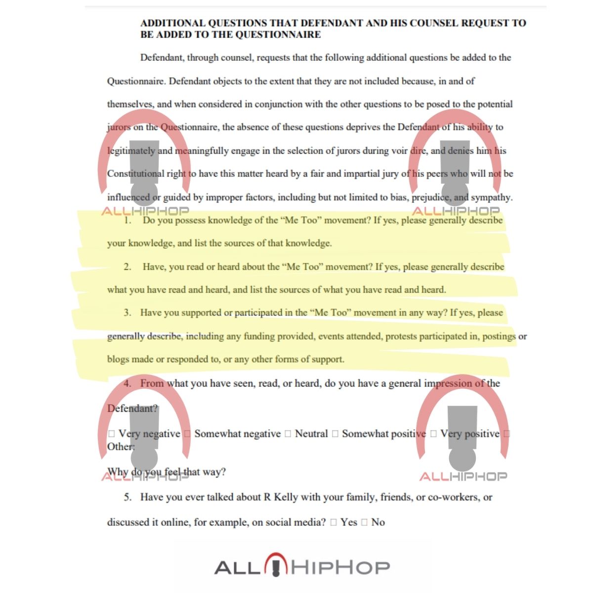 “Have you supported or participated in the ‘Me Too’ movement in any way?…please generally describe, including any funding provided, events attended, protests participated in, postings or blogs made or responded to, or any other forms of support,” reads another question posed by R. Kelly and his defense team.