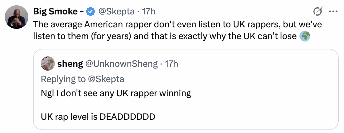 “I wanna clash an American rapper,” he posted on X. “Finally get this UK/US rap debate sorted.”