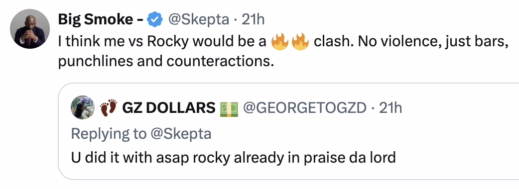And for himself? Skepta suggested a lyrical face-off with his “Praise The Lord (Da Shine)” collaborator A$AP Rocky, calling it a “fire” battle.