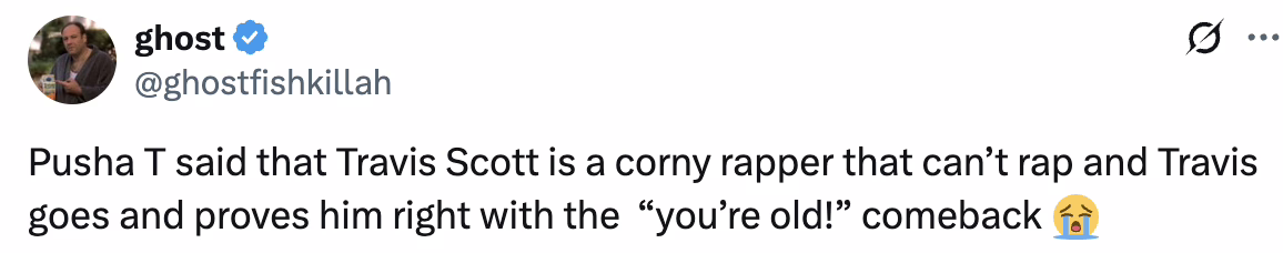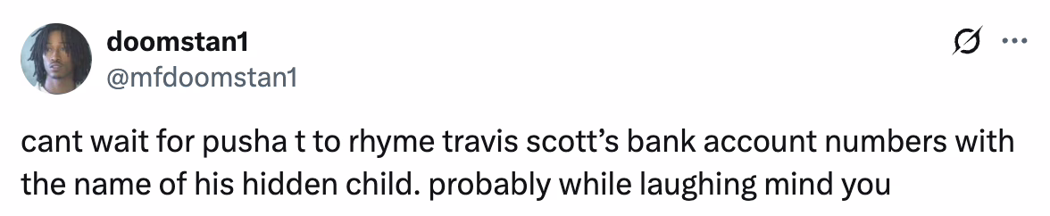 The wordplay on “pushin tees” and the TMZ reference were seen as nods to Pusha’s earlier verse on Clipse’s “So Be It,” where he mocked Scott’s album Utopia, took a swipe at his relationship with Kylie Jenner and questioned his industry ties.